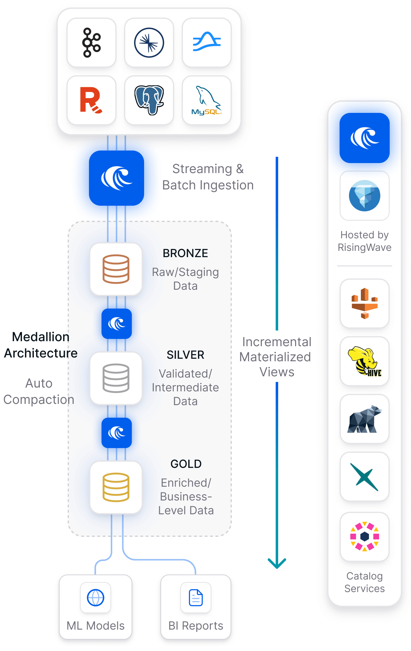 Interoperability is a core design principle of RisingWave. As Iceberg and Delta increasingly become the de facto standards for data lakehouse table formats, RisingWave provides robust read and write support for both.
